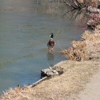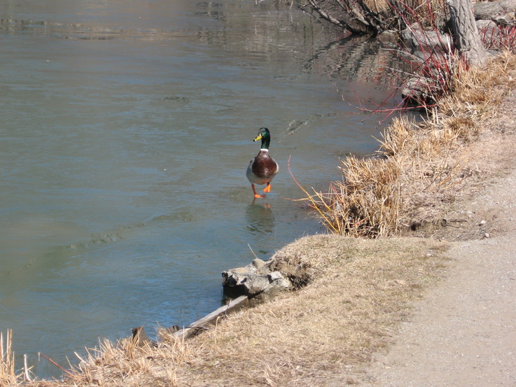 - en-CA Mallard duck standing on the ice at Dufferin Islands.