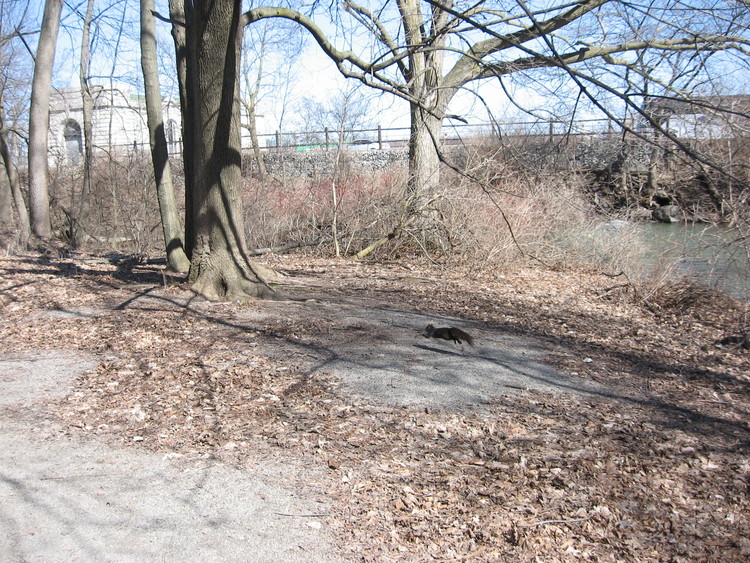 - en-CA Black squirrel running through the woods at Dufferin Islands.