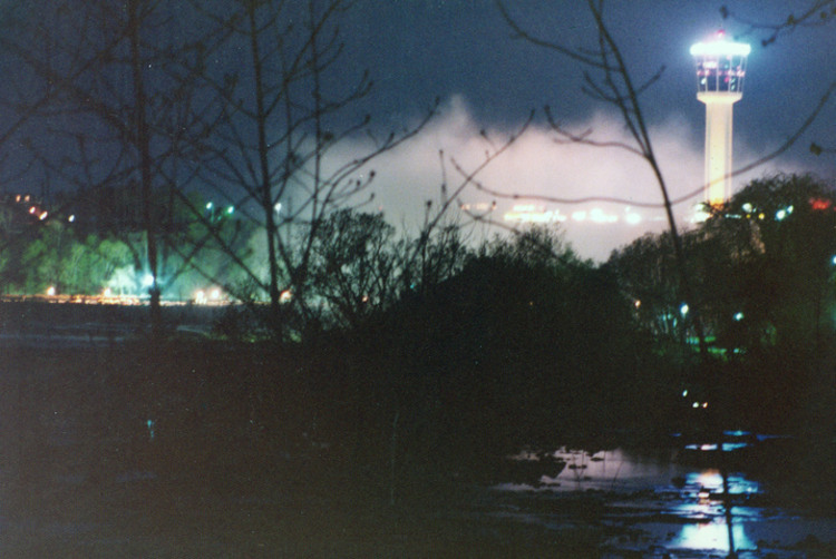- en-CA Three Sisters Island taken at night, with the Minolta Tower in the background