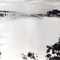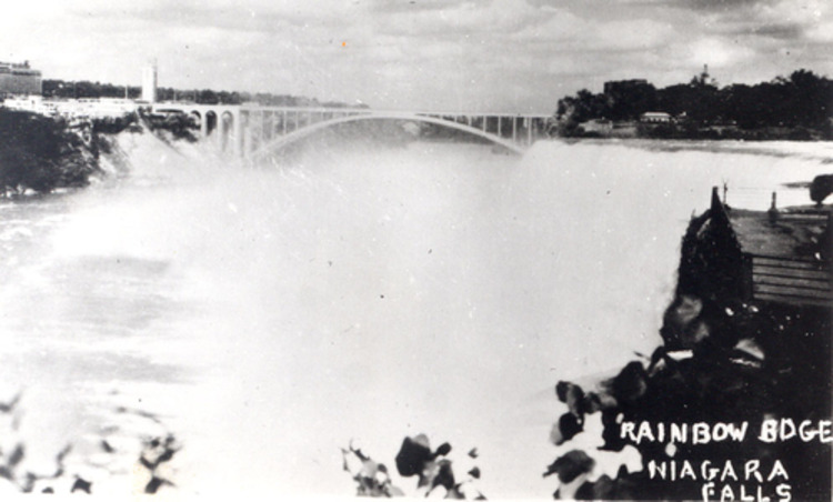 - en-CA The Rainbow Bridge over the lower Niagara River with the American Falls to the side.