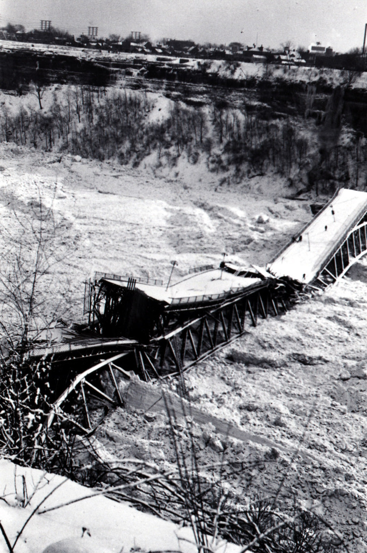 - en-CA On January 27, 1938 an ice jam, exerting enormous pressure on the abutments of the Falls View Bridge, caused it to collapse onto the ice bridge below.