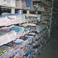 - en-CA Closed stack storage on the second floor. Indexed magazines back filed for reference use. In 1989, some files were discarded to gain space, at a loss to service.