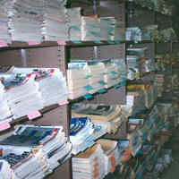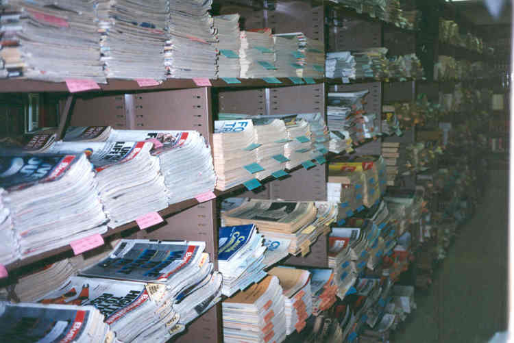 - en-CA Closed stack storage on the second floor. Indexed magazines back filed for reference use. In 1989, some files were discarded to gain space, at a loss to service.