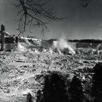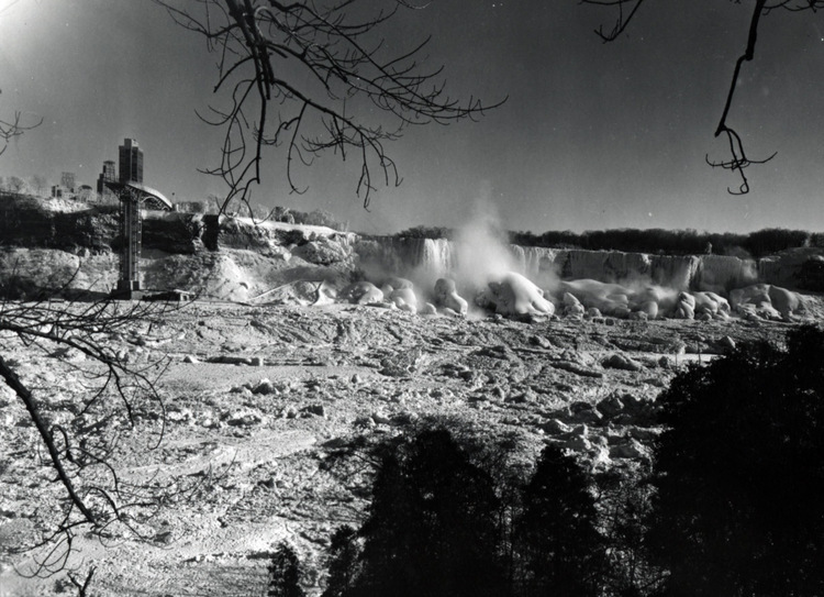 - en-CA The American Falls in winter with the ice bridge in the lower Niagara River.