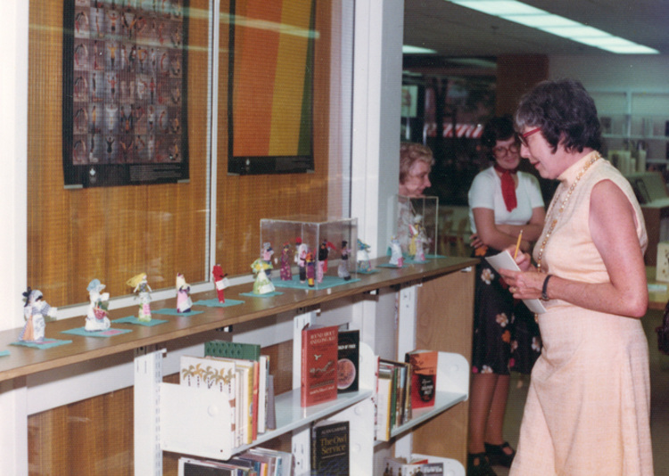 - en-CA Hester Newby judges clothespins dolls made by children for the cultural Olympics program at the library.
