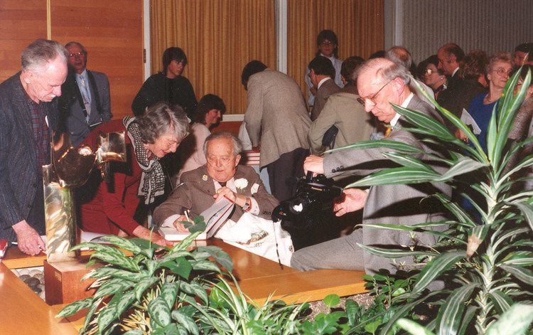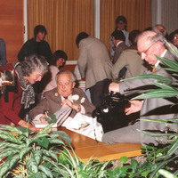 - en-CA George Seibel autographing his book in the lobby of the Victoria Avenue library.