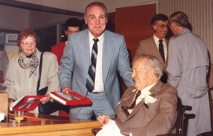 - en-CA George Seibel autographing his book in the lobby of the Victoria Avenue library.