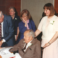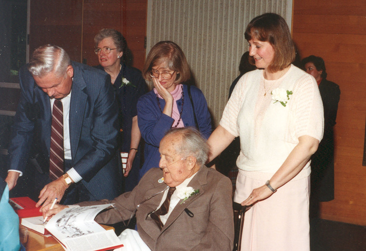 - en-CA George Seibel autographing his book in the lobby of the Victoria Avenue library.