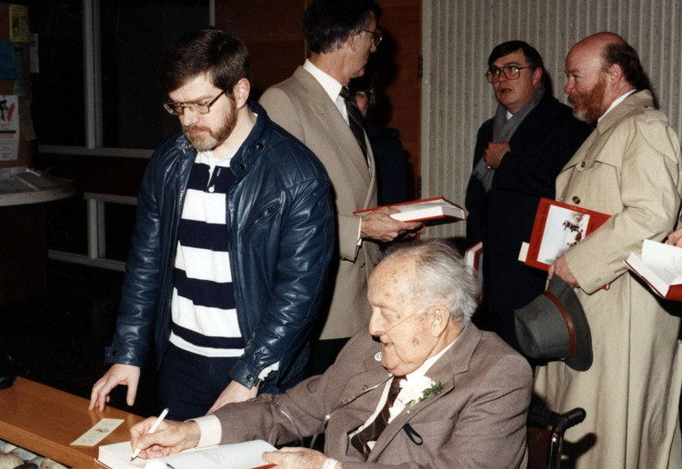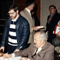 - en-CA George Seibel autographing his book in the lobby of the Victoria Avenue library.