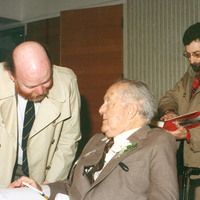 - en-CA George Seibel autographing his book in the lobby of the Victoria Avenue library.