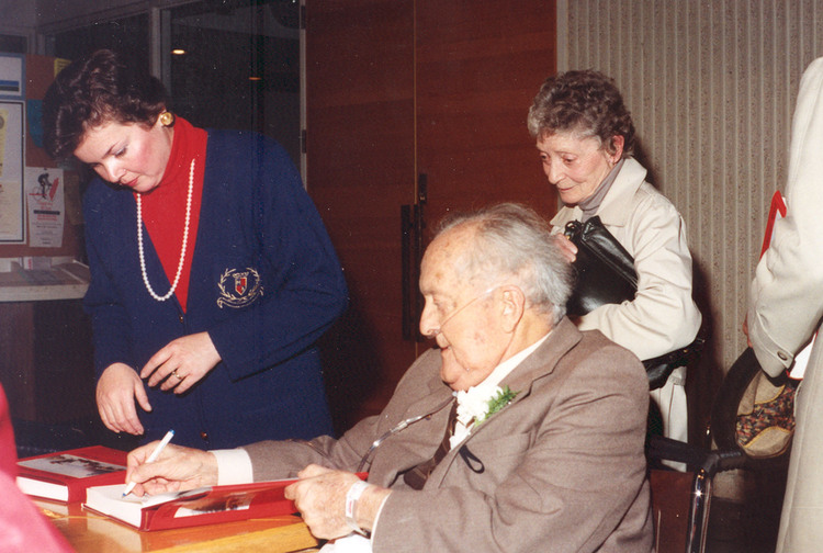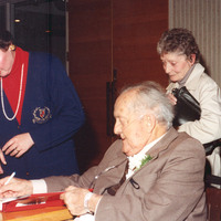 - en-CA George Seibel autographing his book in the lobby of the Victoria Avenue library.