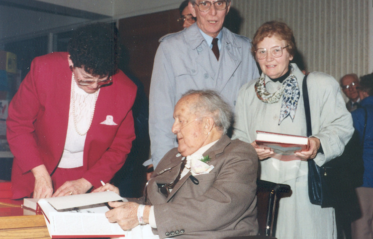 - en-CA George Seibel autographing his book in the lobby of the Victoria Avenue library.