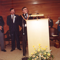 - en-CA Mayor William Smeaton at podium. He presented the first copy of the book to the audience.