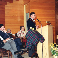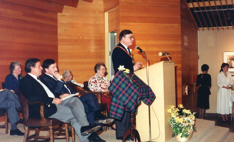 - en-CA Mayor William Smeaton at podium. He presented the first copy of the book to the audience.