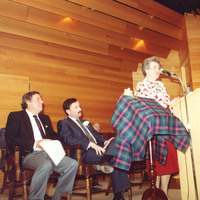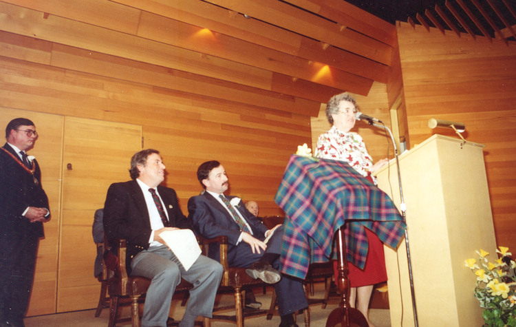 - en-CA Violet Seibel, editor of the book addresses the audience from the podium.