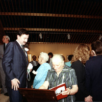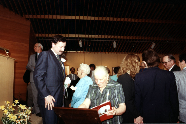 - en-CA Rob Nicholson looks on, while a woman looks through the copy of the book.