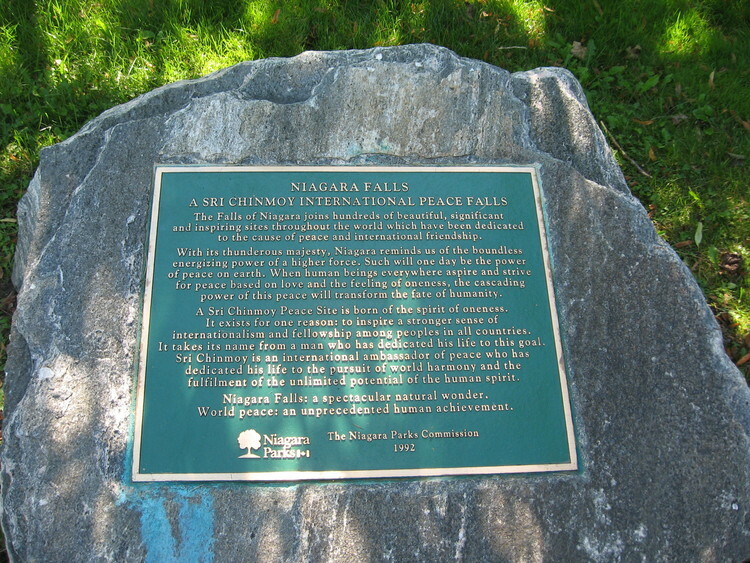 - en-CA A stone & plaque on the grounds of the Floral Showhouse. “Niagara Falls A Sri Chinmoy International Peace Falls. The Falls of Niagara joins hundreds of beautiful, significant and inspiring sites throughout the world which have been dedicated to the cause of peace and international friendship. With its thunderous majesty, Niagara reminds us of the boundless energizing power of a higher force. Such will one day be the power of peace on earth. When human beings everywhere aspire and strive for peace based on love and the feeling of oneness, the cascading power of this peace will transform the fate of humanity. A Sri Chinmoy Peace Site is born of the spirit of oneness. It exists for one reason: to inspire a stronger sense of internationalism and fellowship among its peoples in all countries. It takes its name from a man who has dedicated his life to this goal. Sri Chinmoy is an international ambassador of peace who has dedicated his life to the pursuit of world harmony and the fulfilment of the potential of the human spirit. Niagara Falls: a spectacular natural wonder. World peace: an unprecedented human achievement.