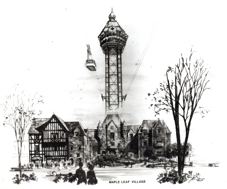 - en-CA Architectural drawing of the front exterior of Maple Leaf Village.
