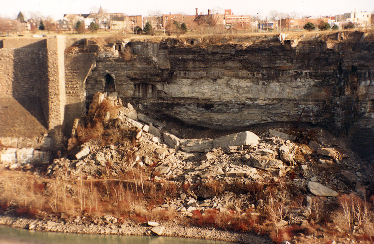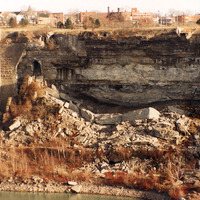 - en-CA Remains of the Schoellkopf Power Station on the American side of the Niagara River, slightly downstream from the Rainbow Bridge. It collapsed into the Niagara River on June 7, 1956
