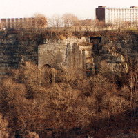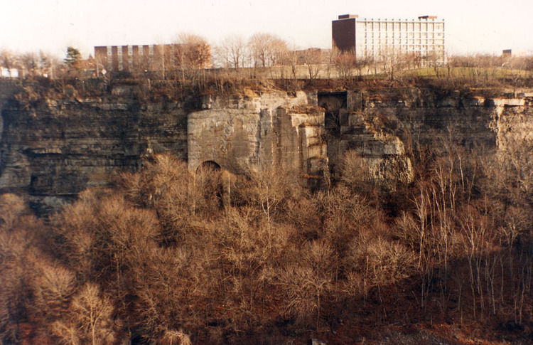 - en-CA Remains of the Schoellkopf Power Station on the American side of the Niagara River, slightly downstream from the Rainbow Bridge. It collapsed into the Niagara River on June 7, 1956