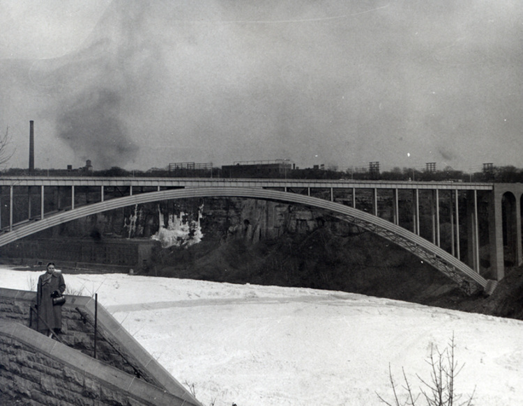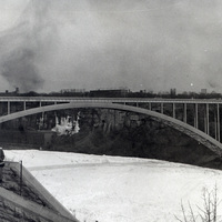 - en-CA Ice bridge in the lower Niagara River with the Rainbow Bridge in the background.