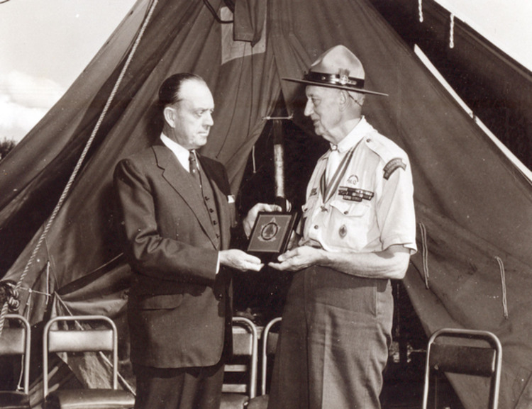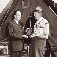 - en-CA Presentation of contingent souvenir plaque to jamboree camp chief. From the book "Jamboree Souvenir Pictures".