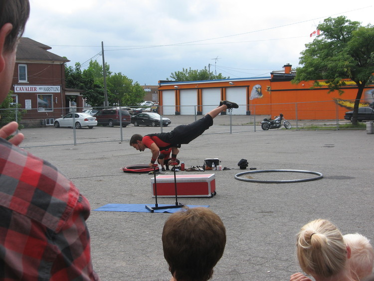 - en-CA Acrobat performs a gymnastics routine. The Eagle's Nest motorcycle shop at 4728 Valley Way and Cavalier Men's Hairstyling at 4098 Buckley St. are in the background.
