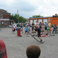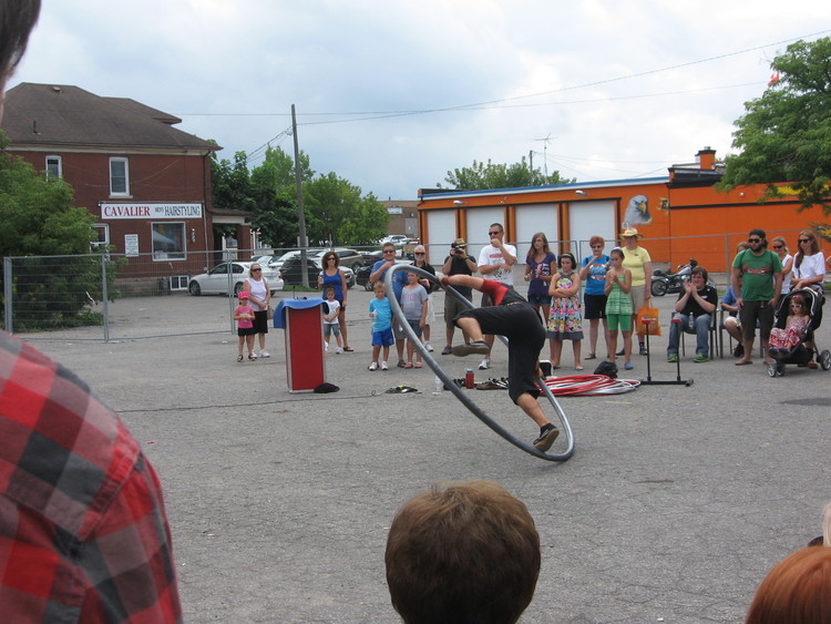 - en-CA Audience watches an acrobat perform a gymnastics routine inside a spinning ring. The Eagle's Nest motorcycle shop at 4728 Valley Way and Cavalier Men's Hairstyling at 4098 Buckley St. are in the background.