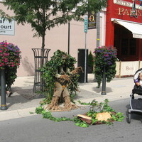 - en-CA A performer costumed as a tree playing music on a saw, in front of the Provincial Offences Court building and Paris Crepes Bistro Cafe.
