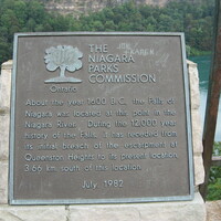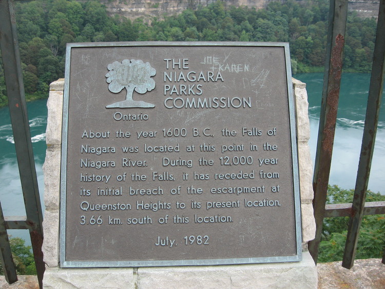 - en-CA A plaque above the Lower Niagara River, on River Road at Queen Street. “About the year 1600 B.C., the Falls of Niagara was located at this point in the Niagara River. During the 12,000 year history of the Falls, it has receded from its initial breach of the escarpment at Queenston Heights to its present location, 3.66 km south of this location. July 1982”.