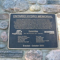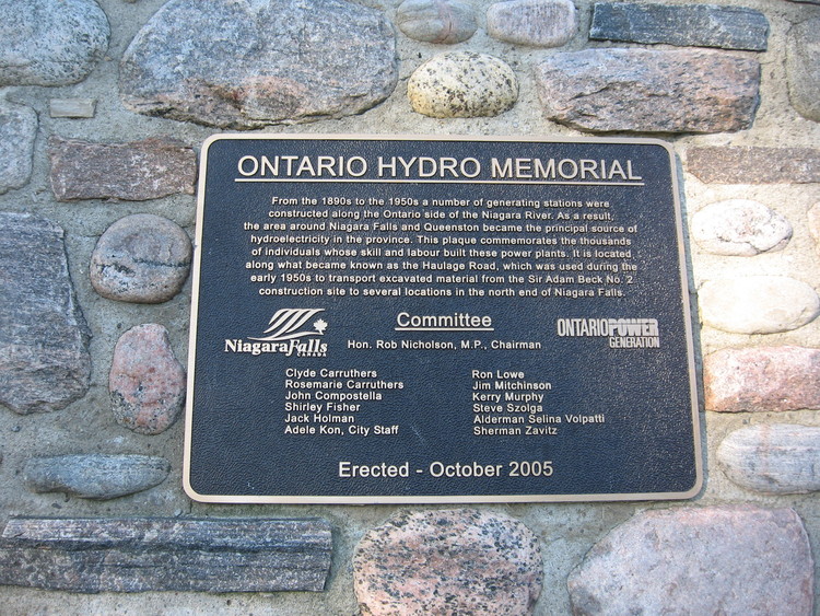 - en-CA Plaque reads: “From the 1890s to the 1950s a number of generating stations were constructed along the Ontario side of the Niagara River. As a result, the area around Niagara Falls and Queenston became the principal source of hydroelectricity in the province. This plaque commemorates the thousands of individuals whose skill and labour built these power plants. It is located along what became known as the Haulage Road, which was used during the early 1950s to transport excavated material from the Sir Adam Beck No. 2 construction site to several locations in the north end of Niagara Falls. Committee: Hon Rob Nicholson, Chairman, Clyde Carruthers, Rosemarie Carruthers, John Compostella, Shirley Fisher, Jack Holman, Adele Kon City Staff, Ron Lowe, Jim Mitchinson, Kerry Murphy, Steve Szolga, Alderman Selina Volpatti, Sherman Zavitz. Erected October 2005”.