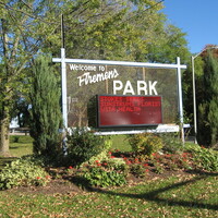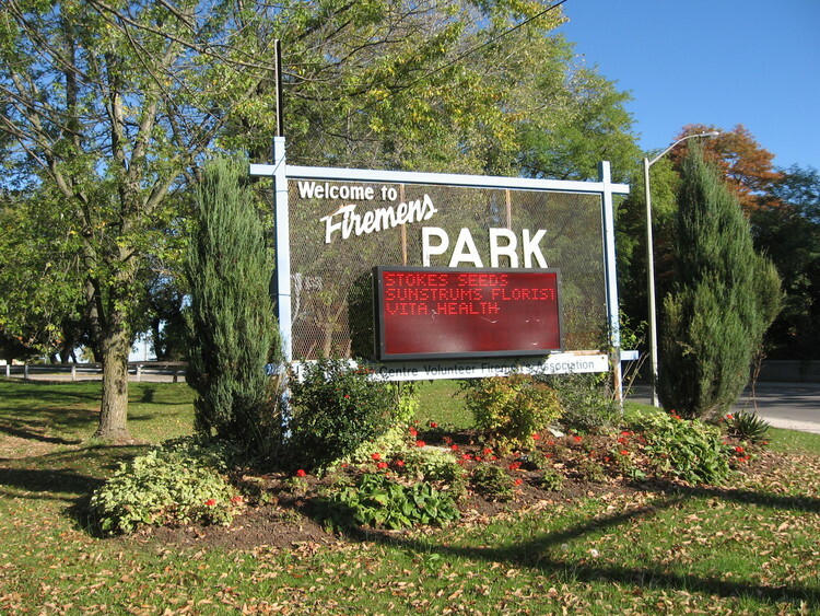 - en-CA Welcome to Firemen's Park sign, advertising Stokes Seeds, Sunstrums Florist and Vita Health.