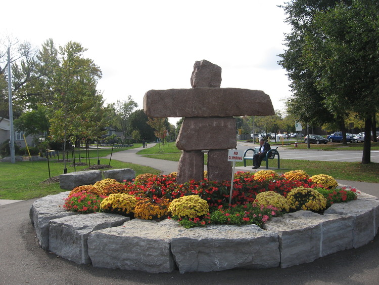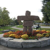 - en-CA Inukshuk surrounded by a flower garden at the Olympic Trail
