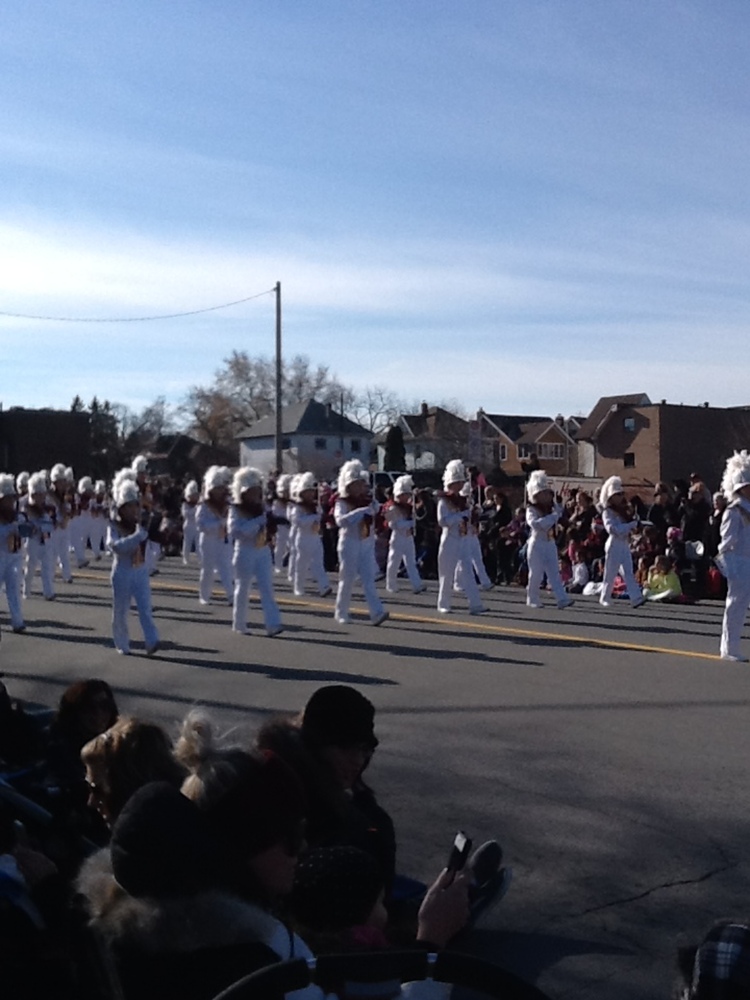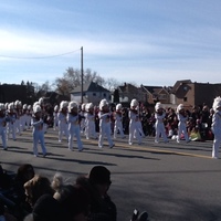- en-CA Santa Claus parade marching band on Victoria Avenue looking south from the Niagara Falls Public Library.