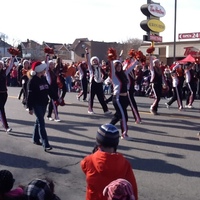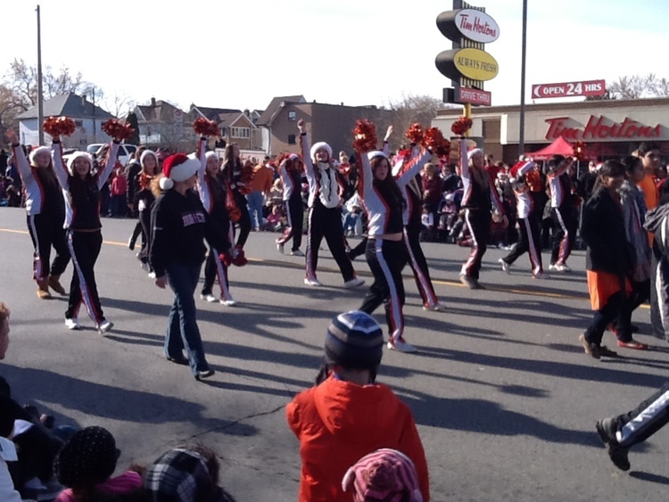 en-CA Santa Claus parade with Stamford Collegiate Cheerleaders in front of the Tim Hortons building on Victoria Avenue, taken from the Niagara Falls Public Library.