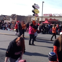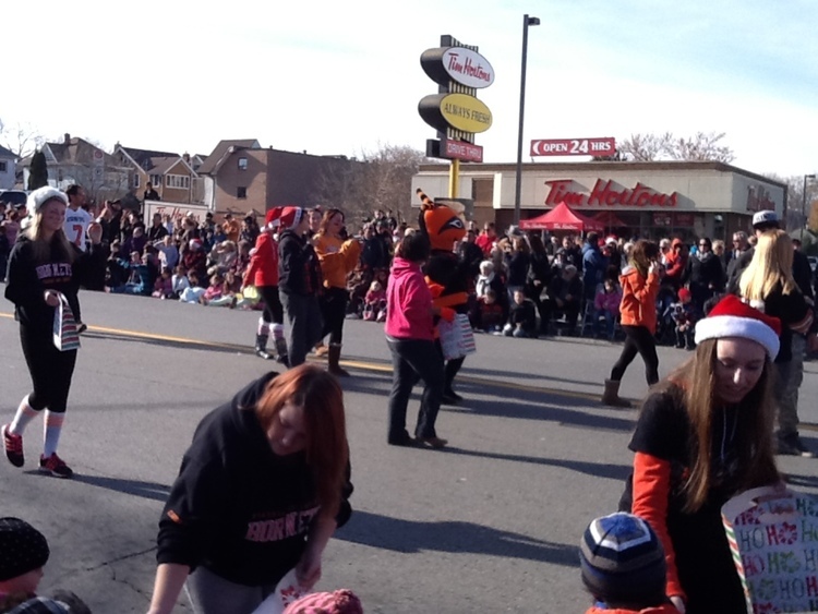 en-CA Santa Claus parade with Stamford Collegiate Cheerleaders handing out treats to the audience in front of the Tim Hortons building on Victoria Avenue, taken from the Niagara Falls Public Library.