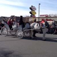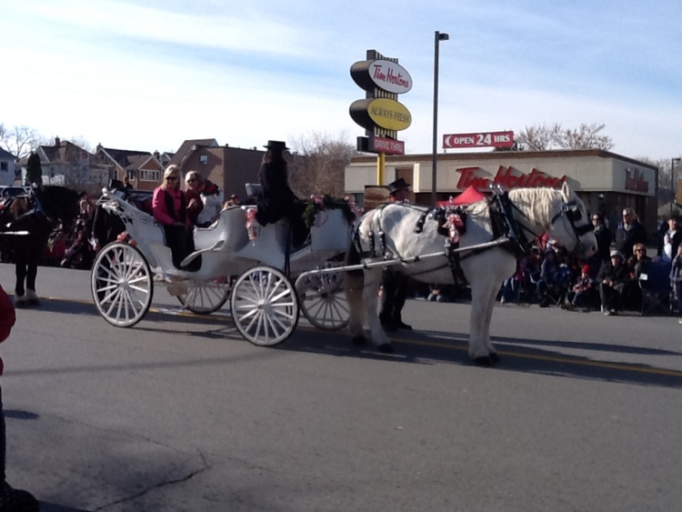 - en-CA Santa Claus parade with horse and buggy with councillors Carolynn Ionnoni and Joyce Morocco in front of the Tim Hortons building on Victoria Avenue, taken from the Niagara Falls Public Library.