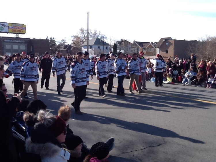 en-CA Chippawa Riverhawks Jr. C Hockey Club in the Santa Claus parade on Victoria Avenue, taken from the Niagara Falls Public Library.