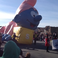 - en-CA Inflatable Smurf and Proud Sponsor Saint Gobain ceramic materials banner in the Santa Claus parade on Victoria Avenue, taken from the Niagara Falls Public Library looking south.