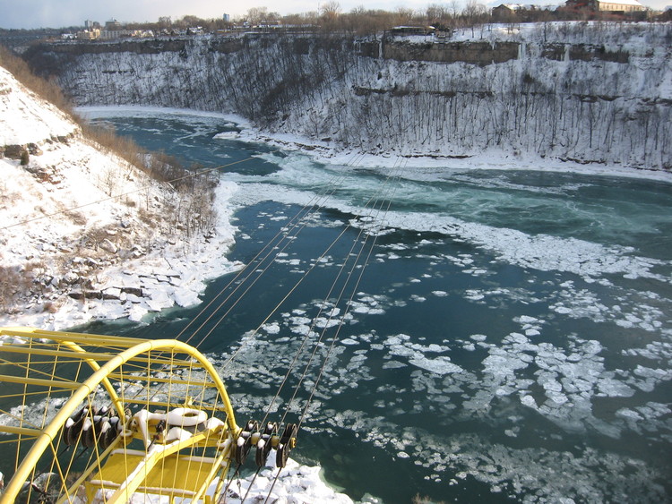 en-CA Lower Niagara River and whirlpool in winter looking south from Thompson's Point Whirlpool Aerocar viewing platform.