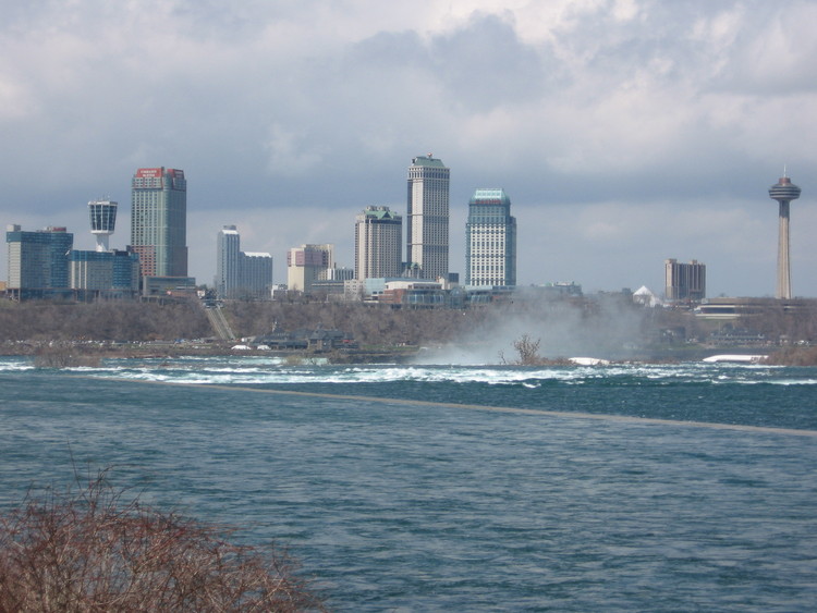 - en-CA Marriott Hotels, Radisson Hotel, Tower Hotel, Embassy Suites Hotel, Incline Railway, Oakes Hotel, Hilton Hotes, Fallsview Casino Resort, Skylon Tower, DoubleTree Hotel and the Niagara Skywheel are visible