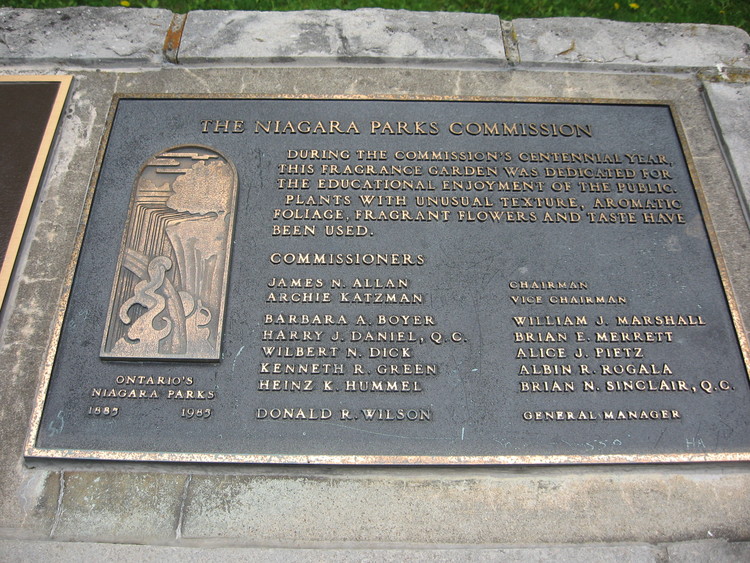 - en-CA Plaque reads: “The Niagara Parks Commission. During the Commission’s centennial year, this fragrance garden was dedicated for the educational enjoyment of the public. Plants with unusual texture, aromatic foliage, fragrant flowers and taste have been used. Commissioners James N. Allan, Archie Katzman, Barbara A. Boyer, Harry J. Daniel Q.C., Wilbert N. Dick, Kenneth R. Green, Heinz K. Hummel, Donald R. Wilson, William J. Marshall, Brian E. Merrett, Alice J. Pietz, Albin R. Rogala, Brian N. Sinclair, Q.C.”