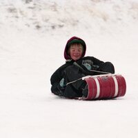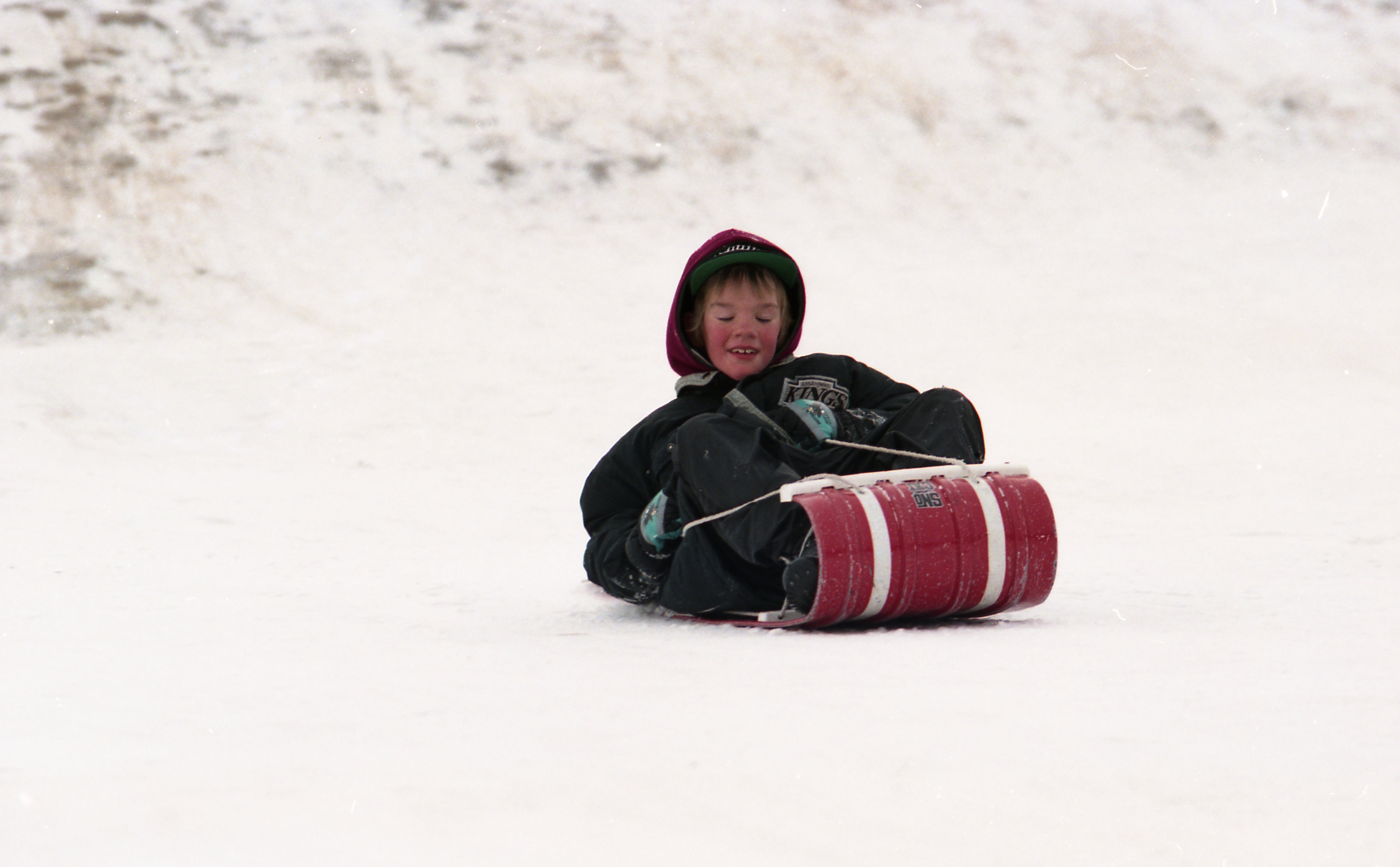 - Jeremy Dekker, 8 years old, going down a snow hill at F.H. Leslie Park.