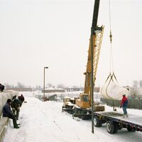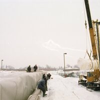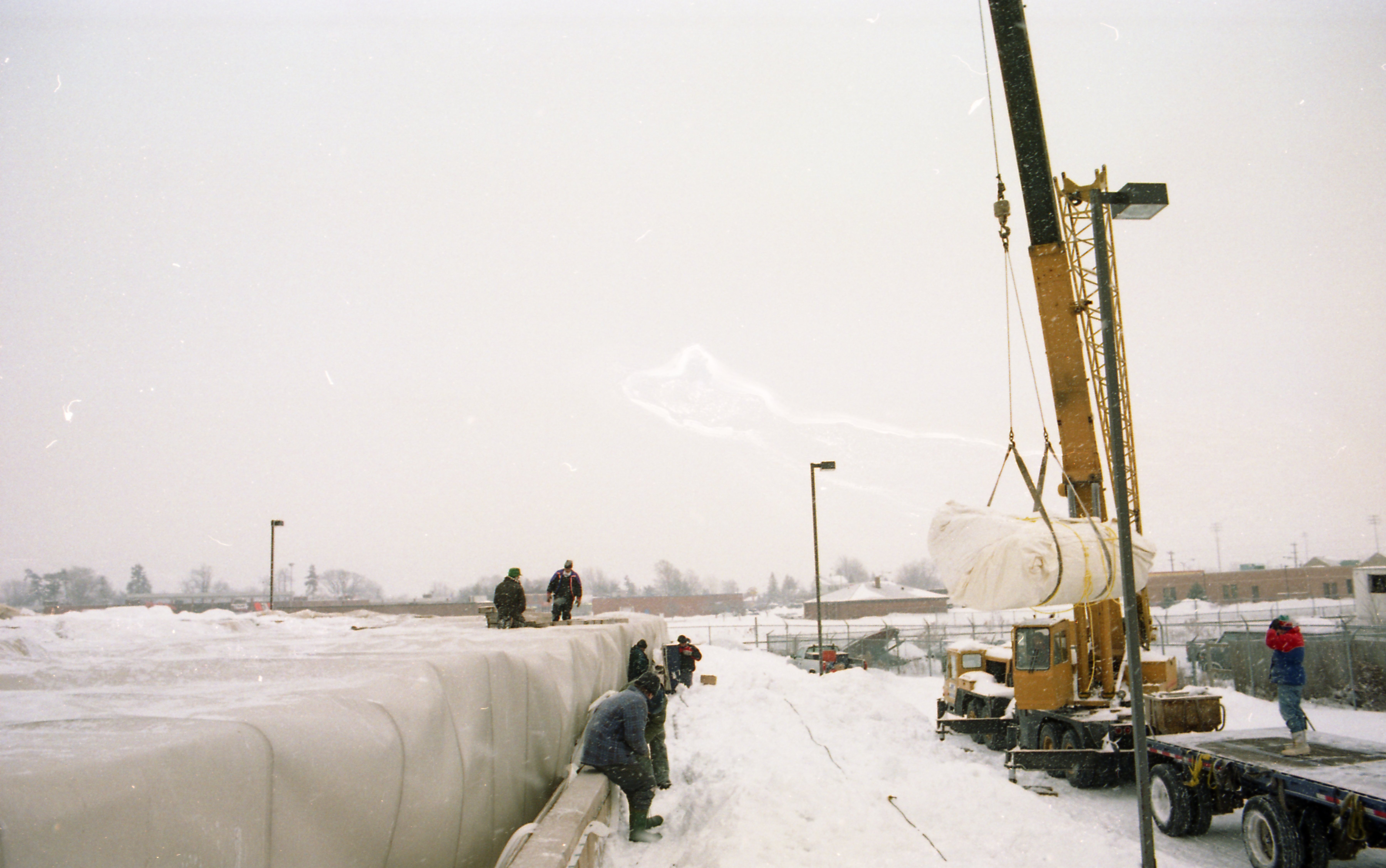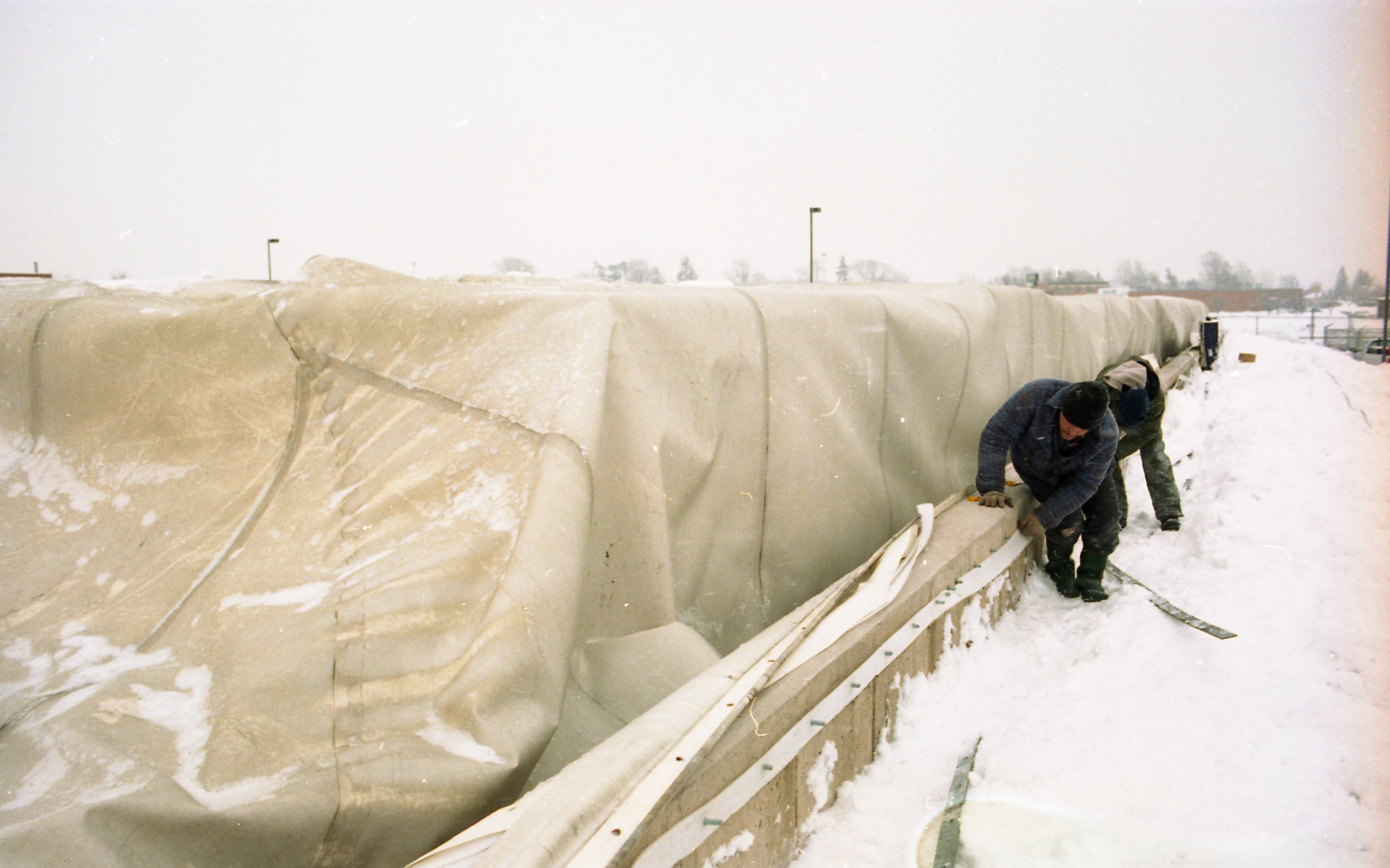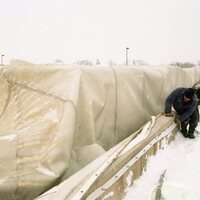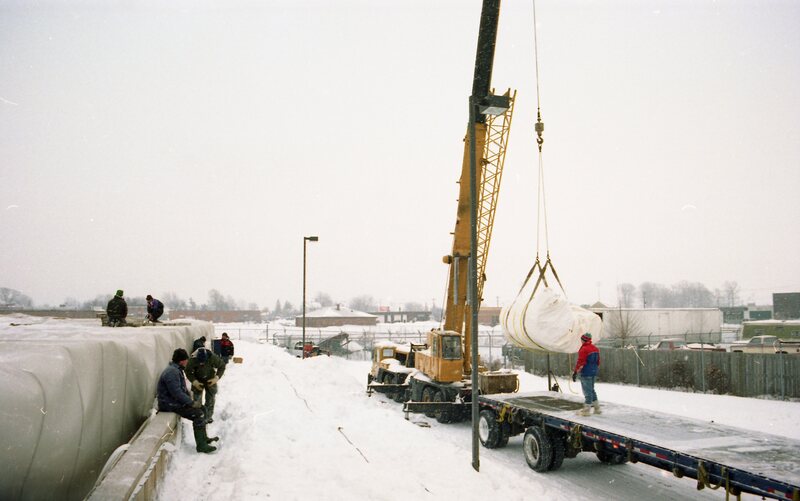 - Company deflates roof of storage building (tent) to replace with new one. The company Yeadon of Guelph supplied the roof. Images show Yeadon employee, Wilson Rhynold, preparing for new roof installation and cranes moving the new roof into position.