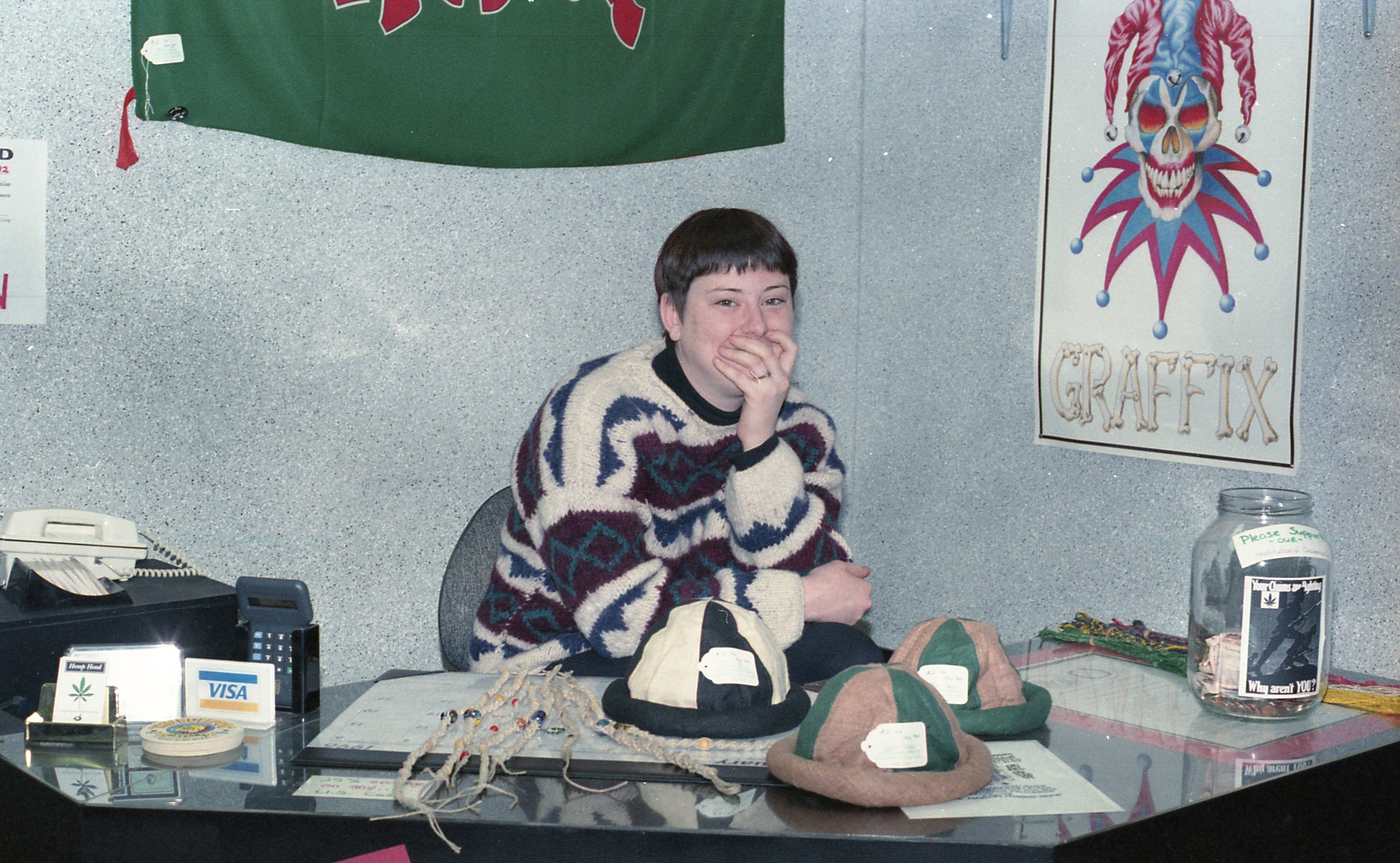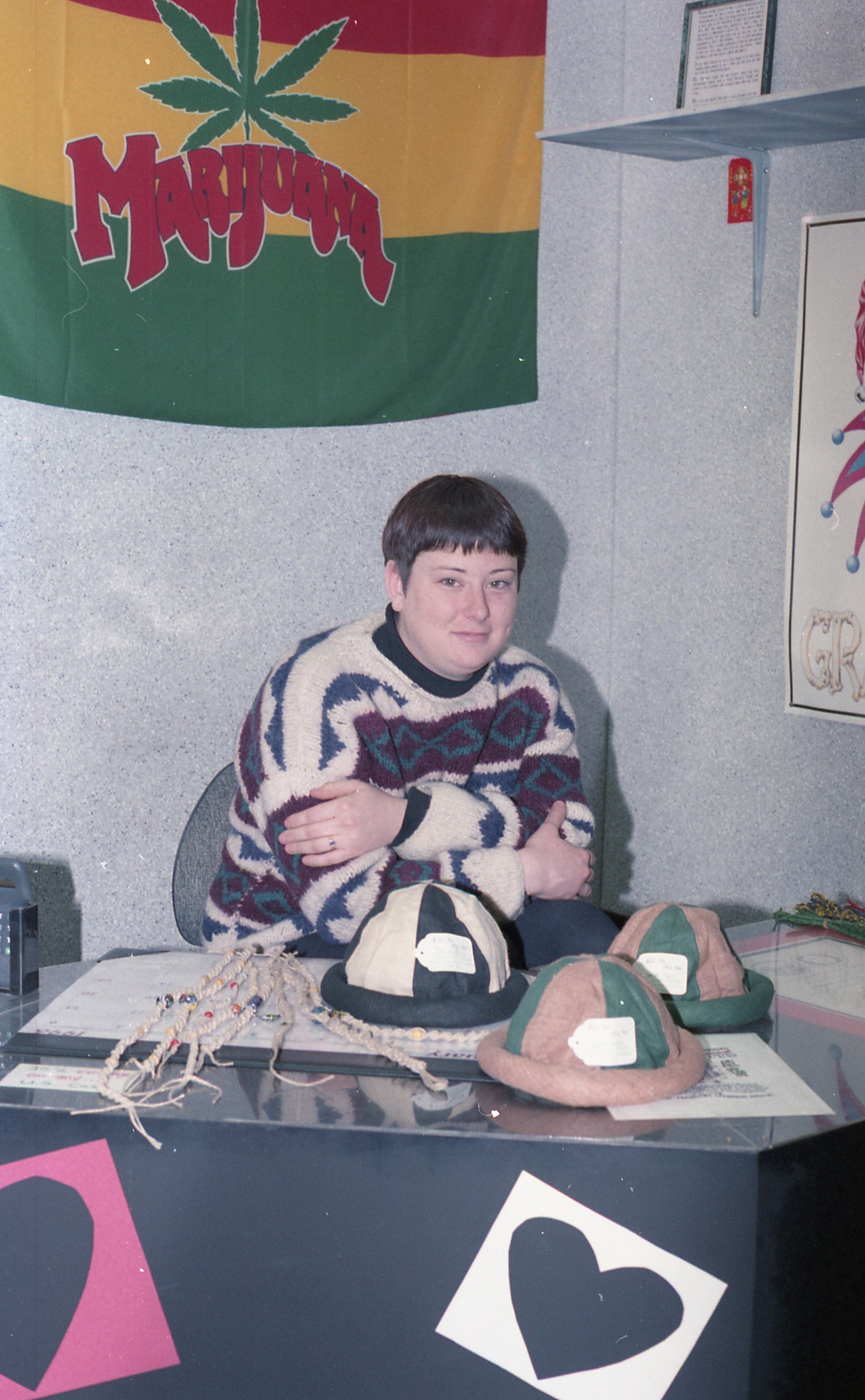 - Shots of owner of Hemp Head Brandi Parfitt sitting in her store with her hemp products.