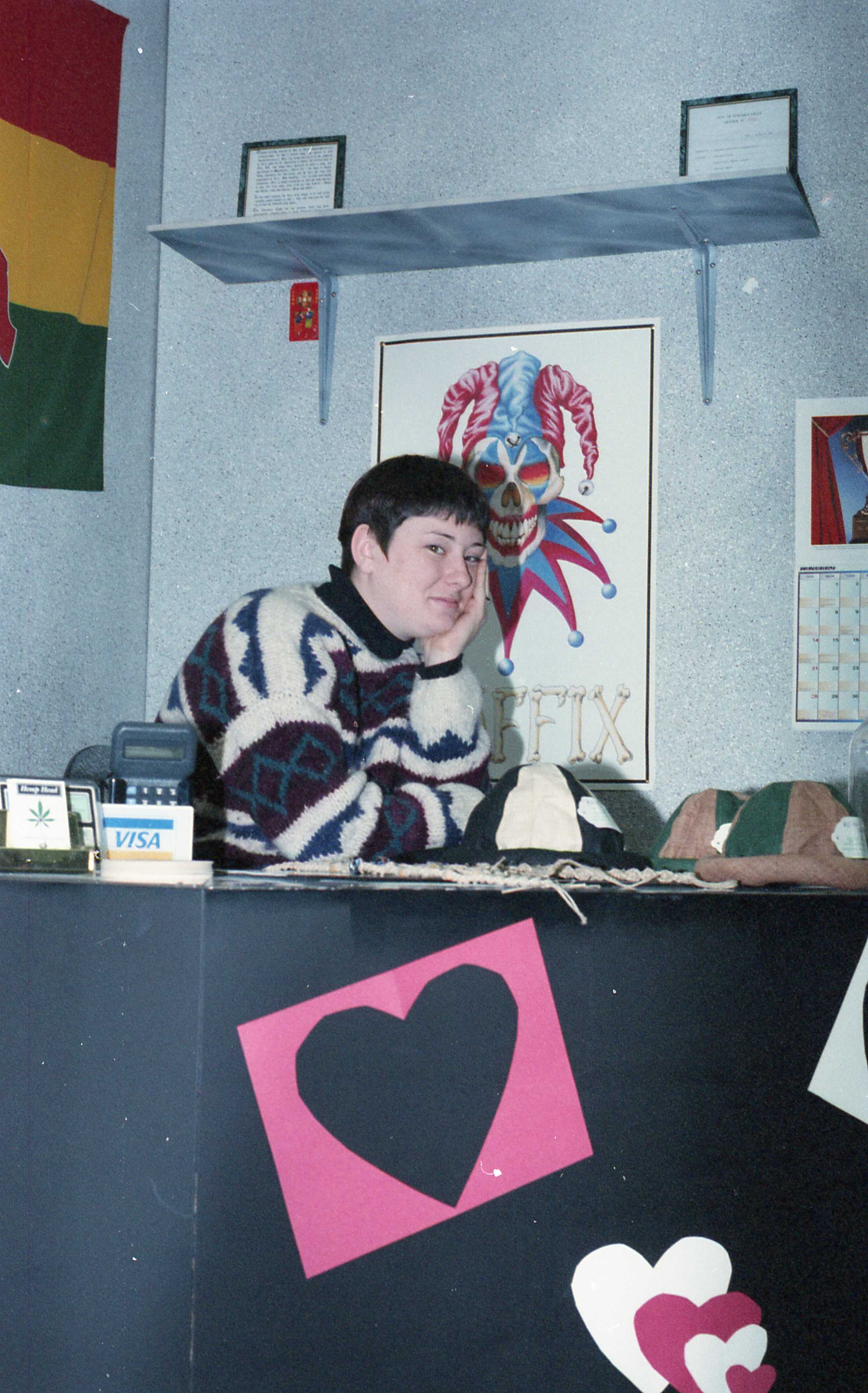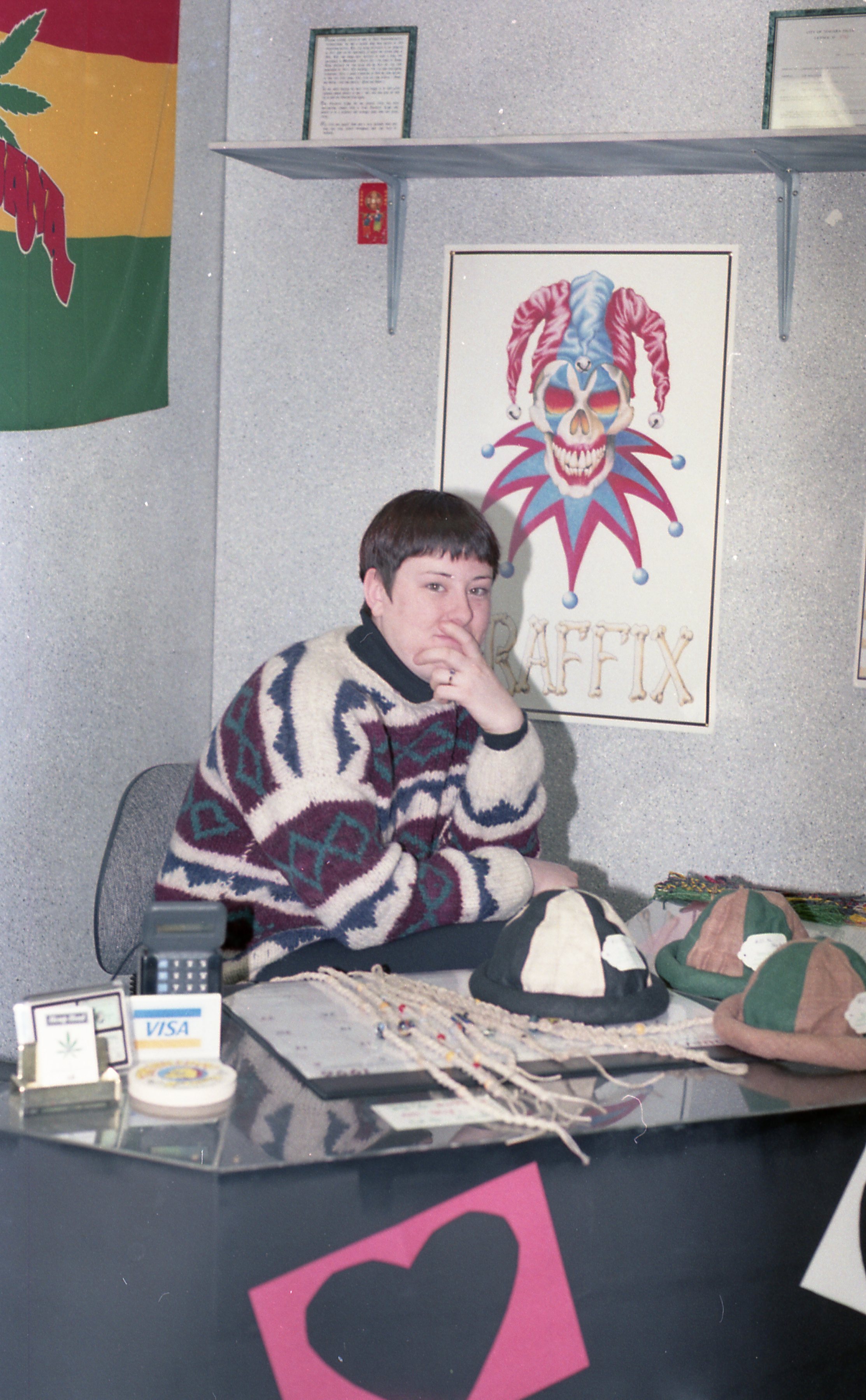 - Shots of owner of Hemp Head Brandi Parfitt sitting in her store with her hemp products.