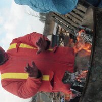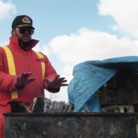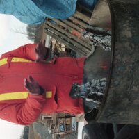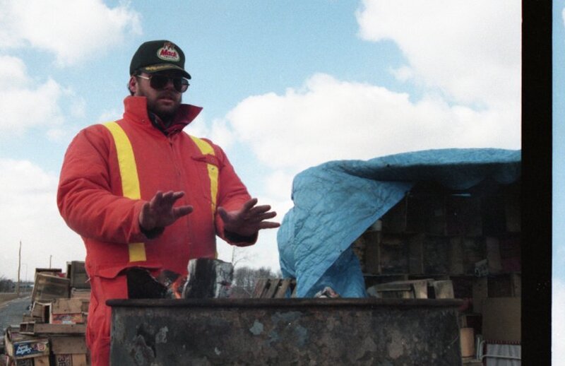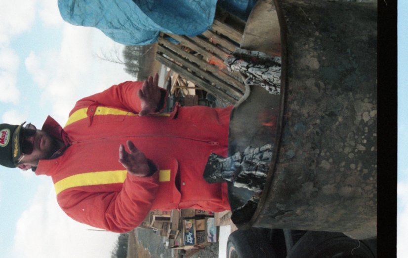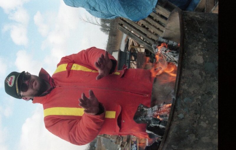 - Picture of striker Al Smith, of OPSEV, warming hands over fire on York Road in NOTL outside of the Ministry of Transportation Yard