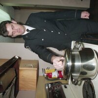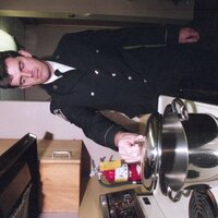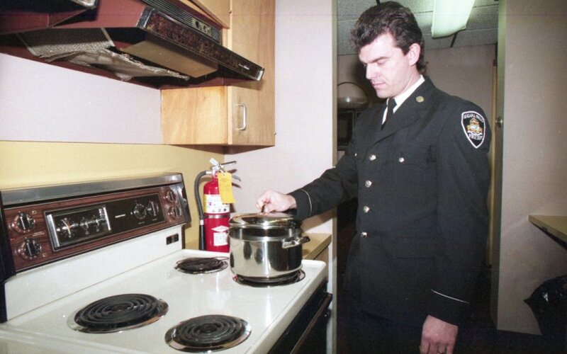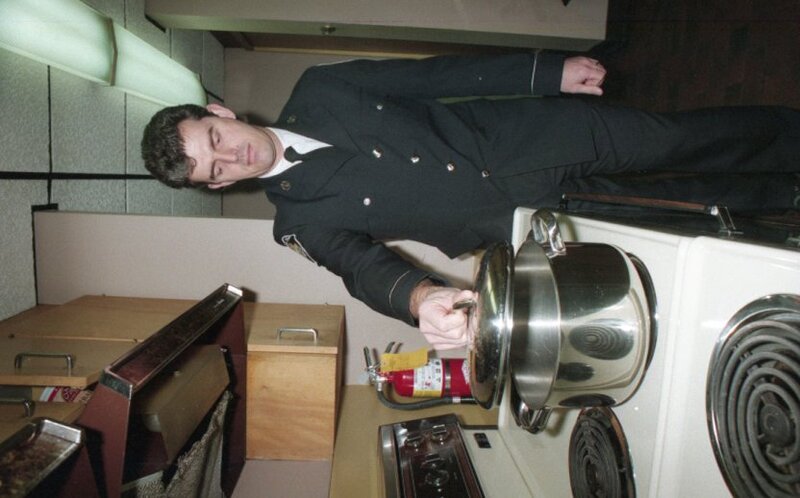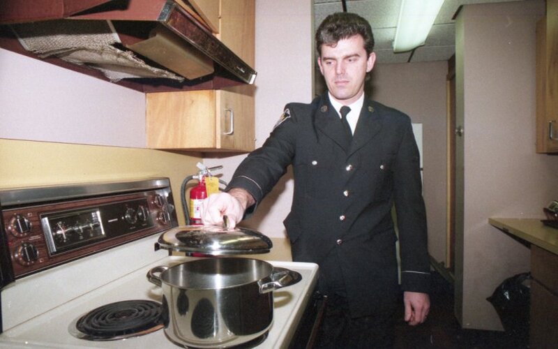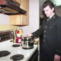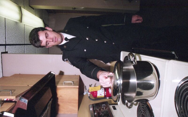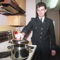 - Lee Smith Fire Prevention officer putting a pot lid on pot as a first stage of fire prevention