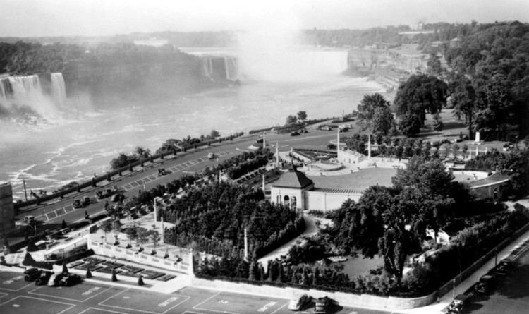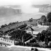 - Oakes Garden Theatre and the Niagara River Boulevard in foreground, American and Horseshoe Falls in background, Ontario Power Station to right of Horseshoe Falls