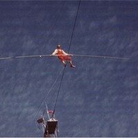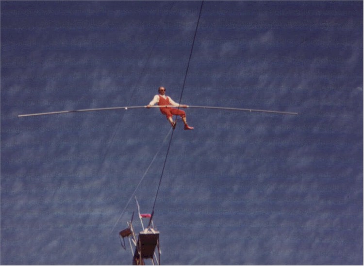 Henri Rechatin walking a tight rope high over Clifton Hill in Niagara Falls